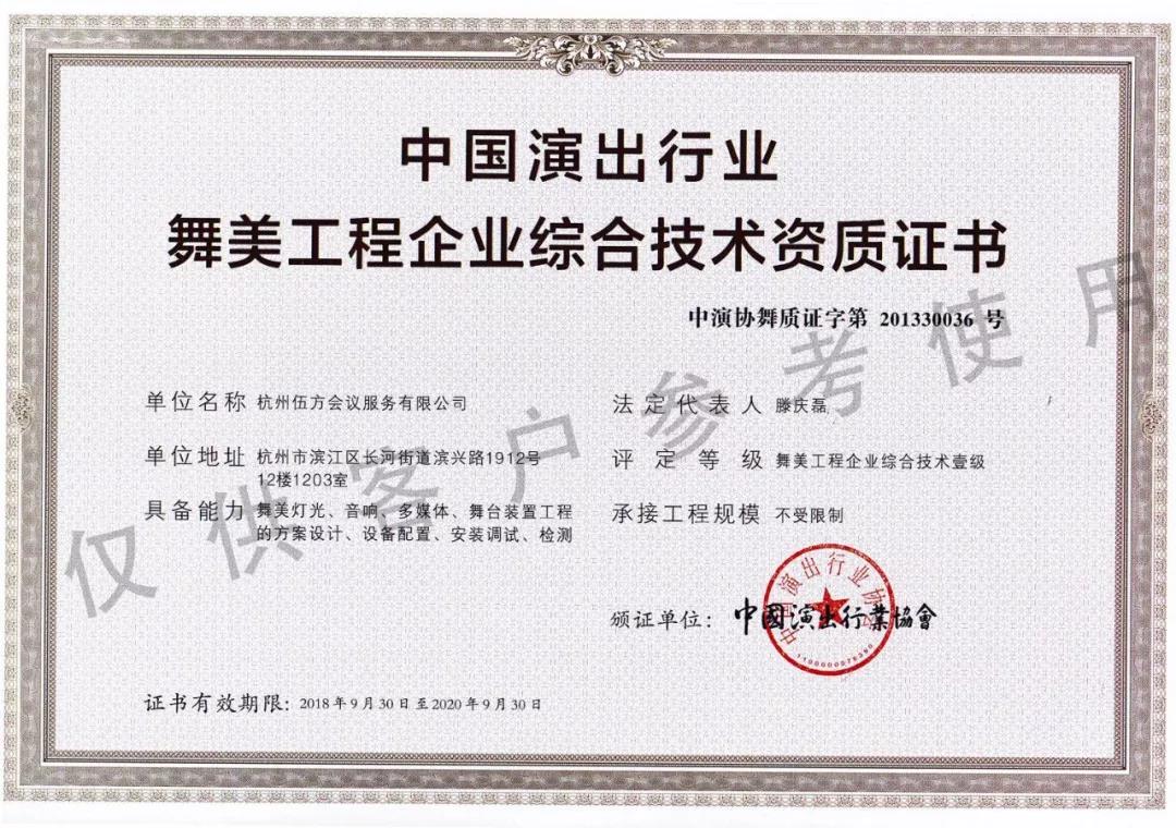 (中國演出行業(yè)舞美工程企業(yè)綜合技術(shù)資質(zhì)證書,評(píng)定等級(jí)為舞美工程企業(yè)綜合技術(shù)壹級(jí))